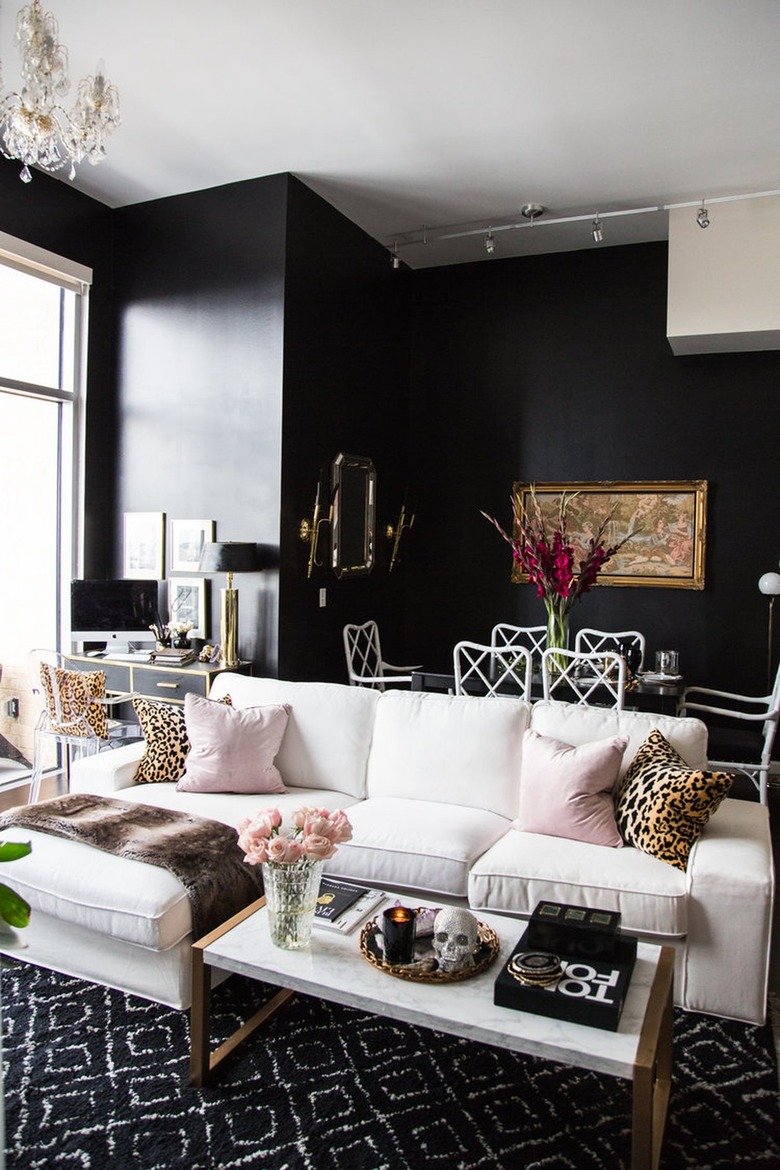 When selecting black paint, opt for a satin enamel or semi-gloss finish to add a little sheen to your walls. The simple choice will make your dark and moody space feel a bit brighter and a little more luxe. In this penthouse apartment by Ashlina Kaposta, reflective black walls pair beautifully with glam pieces of home decor, such as a crystal chandelier, brass accents, leopard print pillows, and a faux fur throw. Complete the swanky scene with a black area rug to make the plush white sofa and marble coffee table stand out even more.