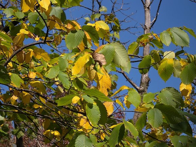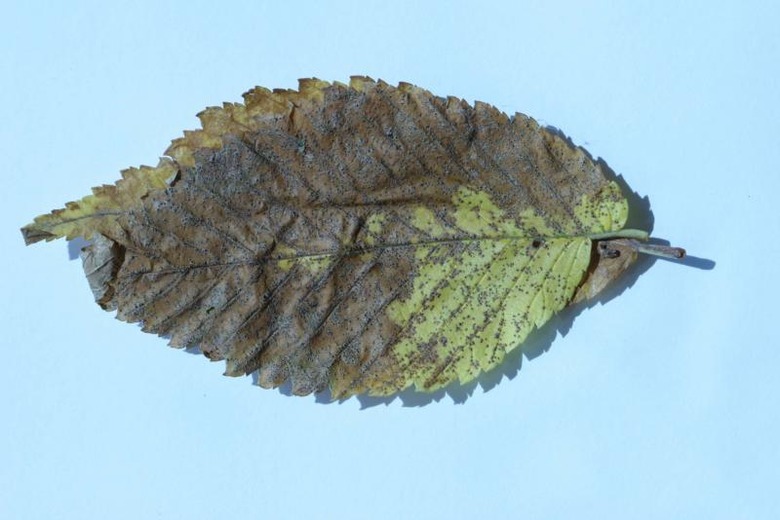 Elm trees are vulnerable to fungal leaf infections. Spot Anthracnose can affect the leaves or the tree's vascular system, causing light brown spots and wilting on leaves and branches. The fungus overwinters in the bark of the tree and can be controlled by burning dead leaves and spraying the tree with a fungicide. Black leaf spot produces small, slightly raised spots on the leaves and causes the leaves to wilt prematurely. It dies off over the winter, so no control is needed.