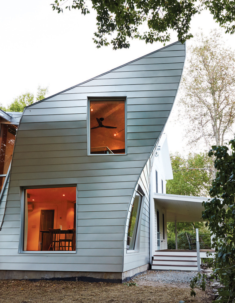 The addition's unusual shape was fabricated by a metalworks company in Chicago. The curves are visible from both the interior and exterior. For the living room, Givone played on classic attributes of a farmhouse by installing a Haiku ceiling fan.