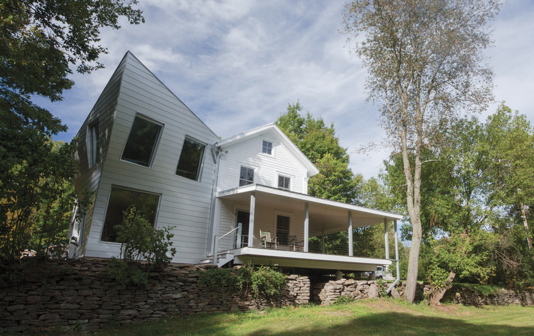 The only stipulation the clients had for the new design was that it needed to bring in more natural light. Givone heeded their request by building large windows within the twisting walls. "Twisting it in this way opened up new sight lines as well," adds Givone. Now they have the ability to view the client's nearby childhood home and the surrounding fields.