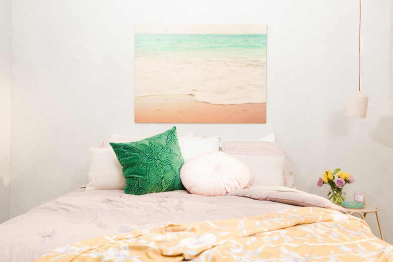 For the final look, inspired by the comfy, retro vibes of the jersey bedding collection, we went for a breezy, California-beach style. "This beachy room reminds me of a colorful summer day," says Xu. "I'm living for the bold pops of color in the emerald green pillow and retro yellow throw. The pink pillow is also my favorite, because it reminds me of a seashell sitting on the beach."