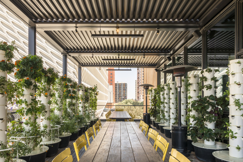 Upstairs, in an outdoor space reserved for private events, you'll find an impressive free-standing garden comprising 27 vertical towers from LA Urban Farms, housing 40 plants each. Their herbs, vegetables, and edible flowers are clipped before and during service to be used in the restaurant's dishes.