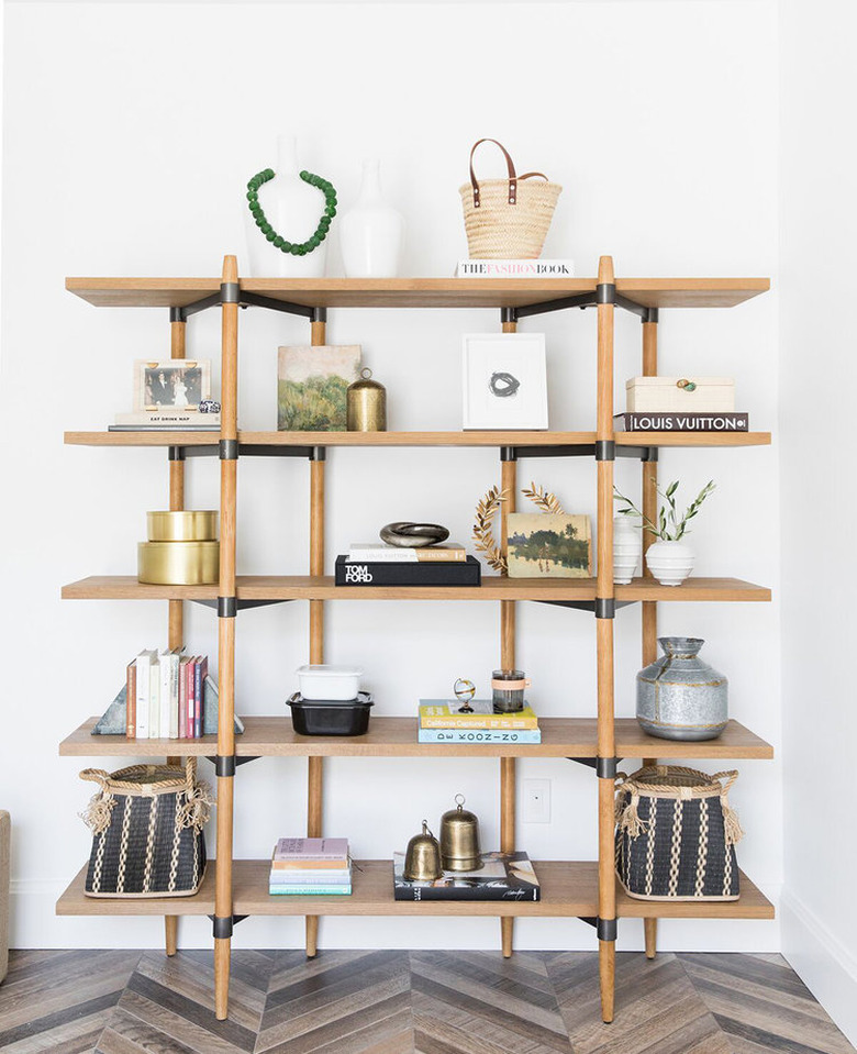 You want your accessories to reflect the overall style and look of your home. For example, if your decor style is traditional, with dark stained woods and fitted fabrics, you would want to select items with a classic feel like brass bookends, leather covered books, oriental vases, or a bronze eagle. Symmetry can also play an important role, so keep this in mind when placing your decorative accents on your bookshelf. Similarly, items in wood, stone, and natural materials will be at home in a room with a more casual vibe — think bohemian or beach chic. Select items like woven baskets, earthy ceramic vases or terra-cotta pottery, driftwood, or geodes, and keep the arrangement loose and asymmetrical.