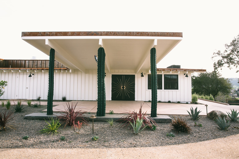 The motel's original porte-cochère was dressed up a bit with faux-cactus pillars, desert-chic plants, and double doors painted black with a gold midcentury-mod starburst. While slightly kitsch, they decided to keep those details. "They were part of the original building, but really in disrepair," says Walker.