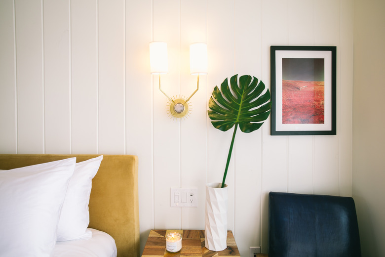 In one of the rooms, a single Monastera leaf in a heavily textured white vase is joined by white vertical shiplap walls and a framed photograph designed to inspire wanderlust.