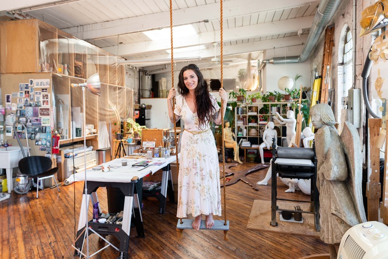 "My favorite things are what I refer to as my 'human-shaped items,'" says Sparacio. The life-sized female sculpture on the left is by the artist who shares the studio space, Jennifer Baker.