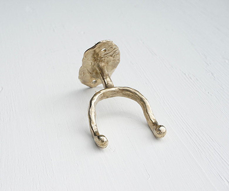 The hook is made from a "lost" wax casting process. I'm not sure what that means by "lost," but it sounds intriguing and special and ancient, so it makes me want it even more. The material is solid, uncoated brass, so it'll patina over time.
