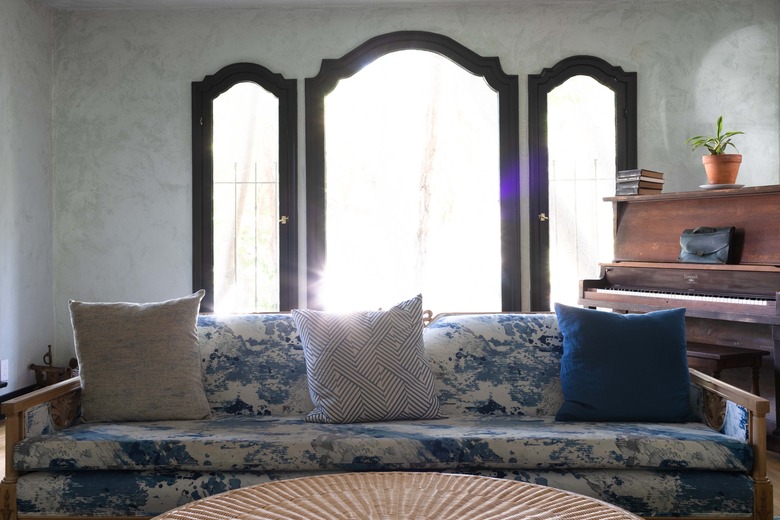 The couch in the bedroom exemplifies the blending of old and modern, which is a hallmark of Taylor + Taylor, the interior design firm that helped with the remodel.