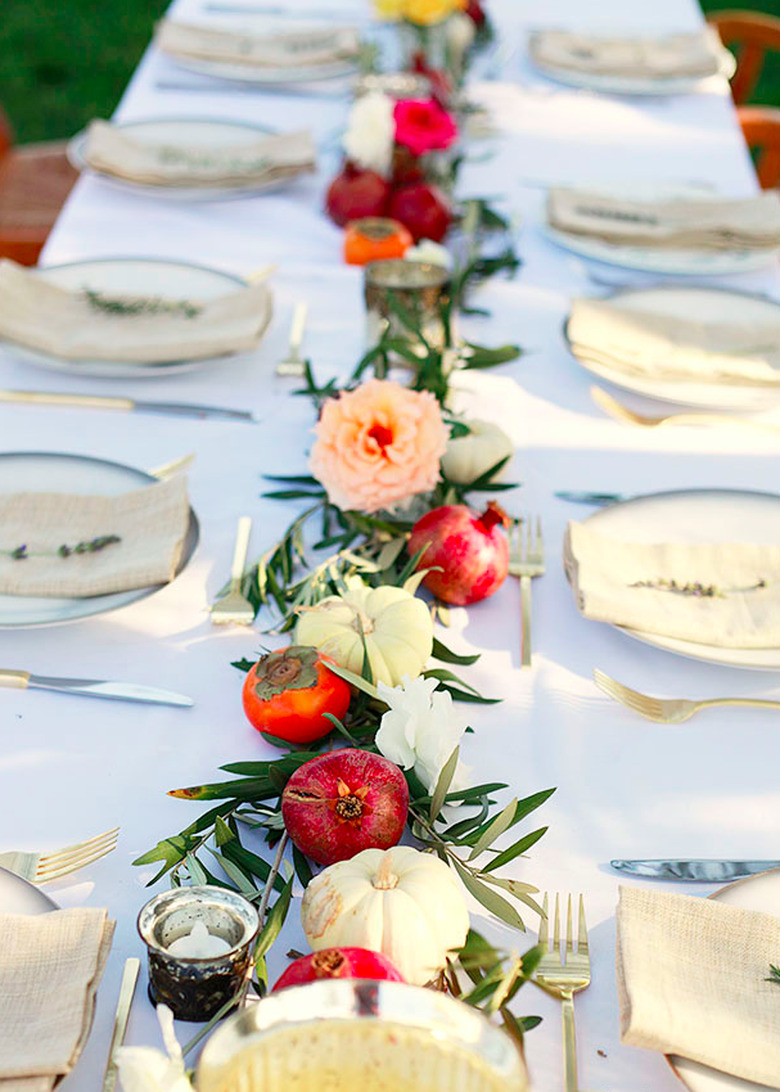 Hunker contributor Trisha Sprouse takes the harvest theme to the next level with this edible table runner. It's a stunning focal point that pulls double duty as a decorative element and a flavorful appetizer. Figs, anyone? With a centerpiece this stunning, you can keep the place settings simple and elegant with white plates and linens. Gold flatware and candleholders add a hint of sparkle.