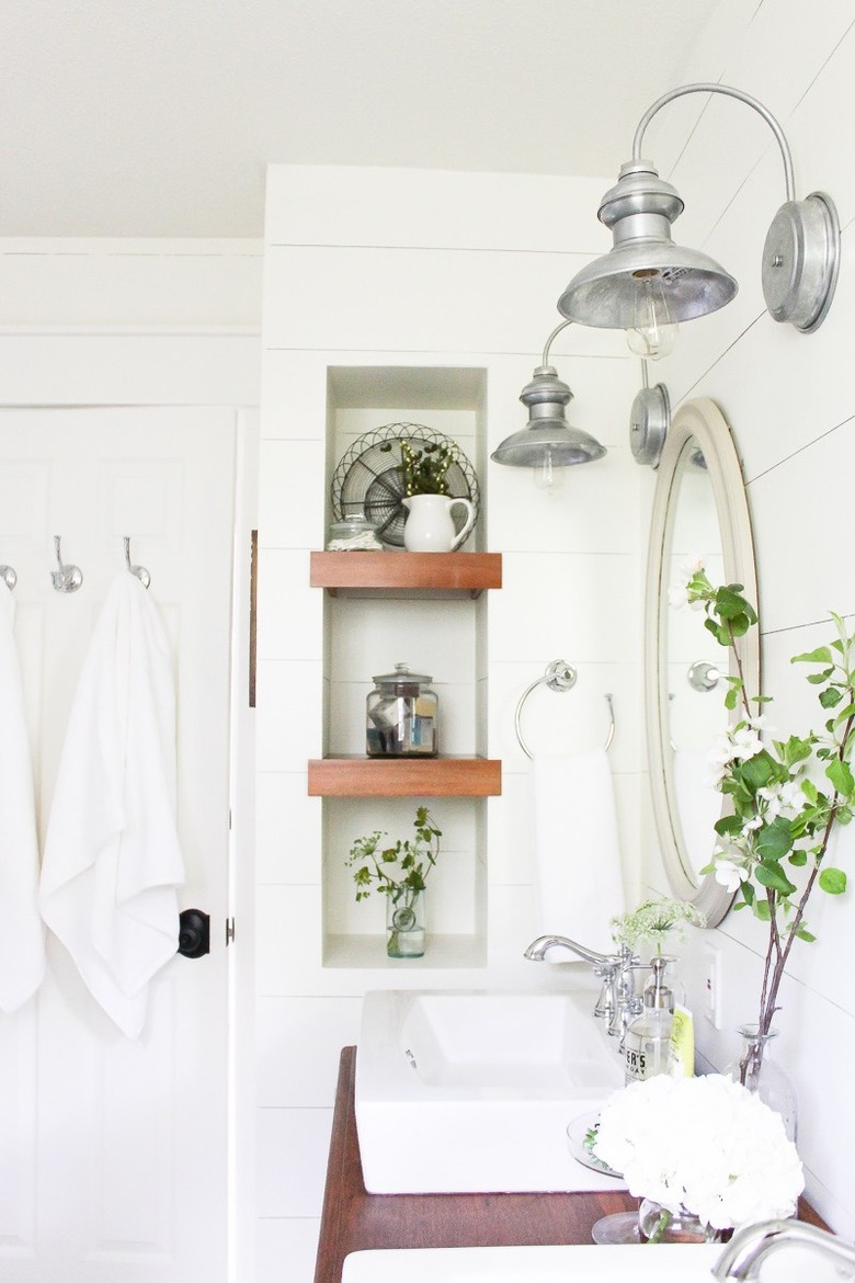 Fall recalls hayrides, pumpkin picking, and that crisp, turn-of-the-season farmhouse scent. To give your bathroom an autumnal feel, add industrial wall sconces and fill your shelving with rustic accents like Kristi from Making It In The Mountains did using thrifted jars and greenery.