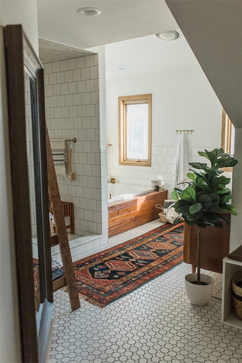 Sure, a rectangular bath mat will get the job done in a small bathroom. But if your master suite is a little larger, throw down a cozy runner. Bre Bertolini from Brepurposed did just that in her bathroom makeover, and we can't get enough of its fall-inspired colors.