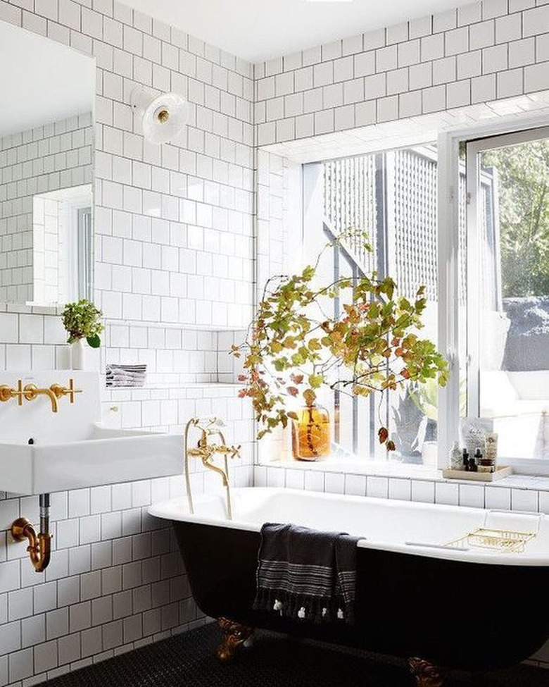 Fall celebrates all things of the earth. Mimic that feeling, like the owners of this black-and-white Australian bathroom did, with a gorgeous leafy green arrangement.