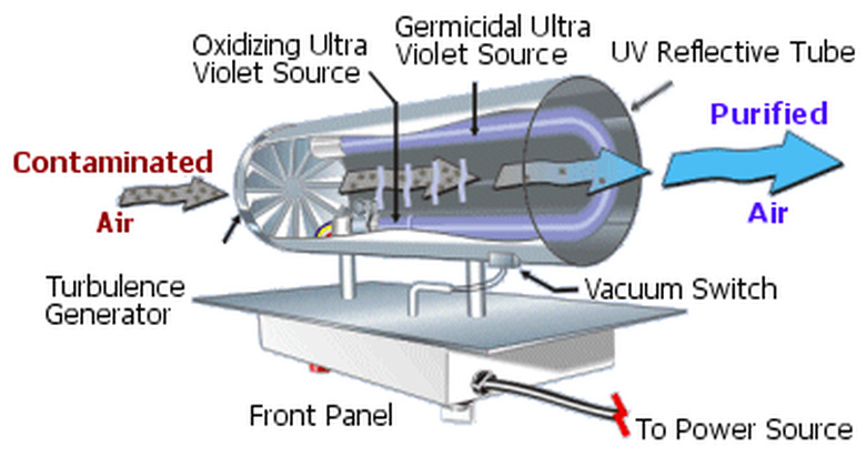 The sun emits an entire spectrum of ultraviolet radiation, and fortunately, the earth's atmosphere filters 100 percent of the most harmful type. This radiation, known as UV-C, harms cells by destroying nucleic acid and disrupting their DNA. This principle is used in UV air purifiers. Because it has an internal lamp that emits this harmful radiation working in conjunction with a HEPA filter, a UV air purifier not only filters out mold spores, bacteria and other pathogens, but it also kills them. The lamp is in a radiation-proof enclosure, so no one in the vicinity of the air purifier is in any danger of exposure.