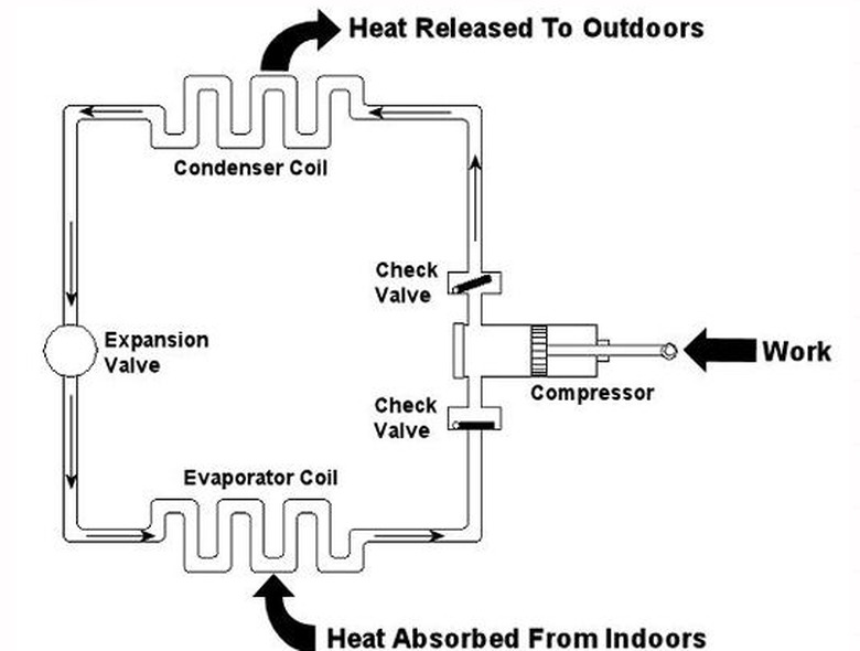 A refrigerator actually has two sets of coils, and they are at opposite ends of the refrigeration cycle. In a typical refrigeration system, a condenser pressurizes a refrigerant— usually _tetrafluoroethane—_and sends it as a liquid through a system of condenser coils to an expansion valve. This is a small aperture, much like a spray nozzle. The liquid that makes it through evaporates in a second coil system—the evaporative coils—and the change of state sucks heat from the air and cools the environment around the coils, much as the evaporation of sweat cools the human body. The refrigerant passes back into the condenser chamber through a check valve where it begins the cycle again.