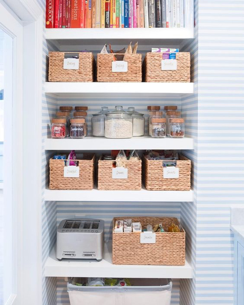 Go-to staples, such as brown sugar and chia seeds, find a home in dedicated labeled containers in this small pantry closet designed by The Home Edit. On the other hand, snacks that are interchangeable, or one-offs, are temporarily stored in woven baskets. Genius!