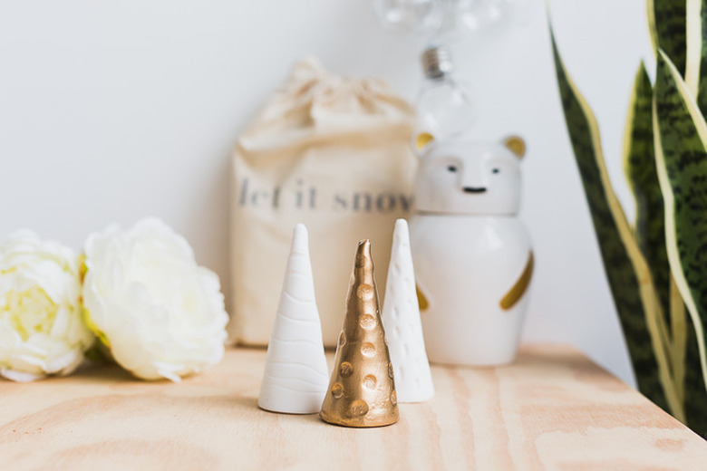 Welcome to your answer to easy holiday DIY decor: mini handmade clay Christmas trees. For this tutorial, we've gone for a gold and white theme (a festive classic), but there's nothing stopping you from having a little fun with pops of color. You can customize them to go perfectly with your holiday decorations. Don't you think this would be a fun weekend project to do with your family and friends?