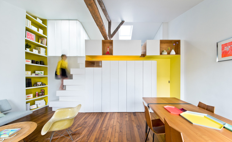 The client, a young fashion designer, wanted to make the 775-square-foot layout feel less chaotic and more spacious. The result combines the apartment's historical characteristics (exposed beams, gorgeously worn wood floors) with fresh and unapologetically fun details: a rainbow floor and hydroponic garden in the kitchen and a modern Jenga-like staircase leading to the mezzanine. Meaning, yes, there are even more steps to take. But clearly, it's all worth it. Take a look: