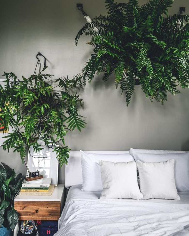 Over the years, I've realized that one of the easiest ways to clutter tight square-footage is to fill it with numerous smaller objects. Oftentimes it's more suitable to install one large piece of furniture or decor in lieu of grouping several smaller items in the same spot. A carefully selected plant with branches or leaves at staggered heights can breathe boho life into a space just as well as, say, four smaller plants that might cramp an accent table. Also, don't limit your decorative layering to just eye level and below. You can keep surfaces clear by hanging decor from the ceiling instead. One of my favorite examples of going vertical is Katie's bedroom from BranchAbode.
