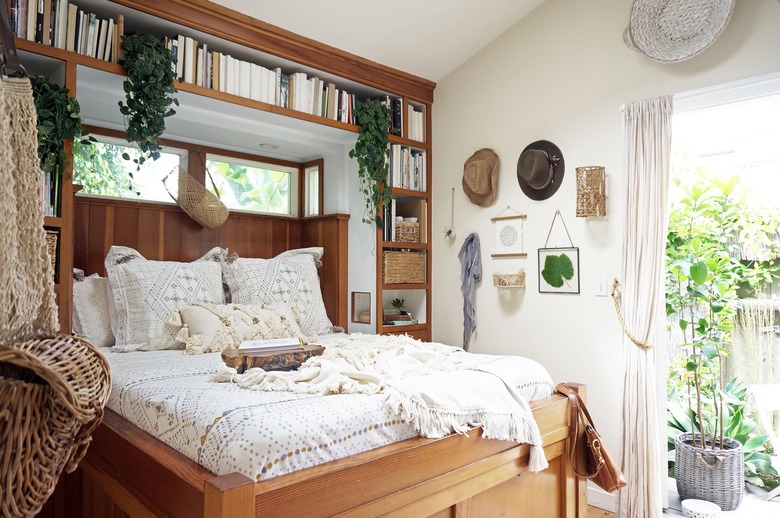 Organic materials sing to the free-spirited nature of bohemian decor, and they're also more sustainable and healthier for our planet than their plastic or manufactured counterparts. They mix-and-match well, and their open weave construction is ideal for a small space, allowing light and air to pass through. Instead of buying a new "boho" basket, try repurposing a vintage item (made from natural materials) to serve a utilitarian purpose while also operating as decor. This keeps your number of belongings in check, ensures that they're functional (or, hopefully, multi-functional!), and adds to the overall style of your bedroom.