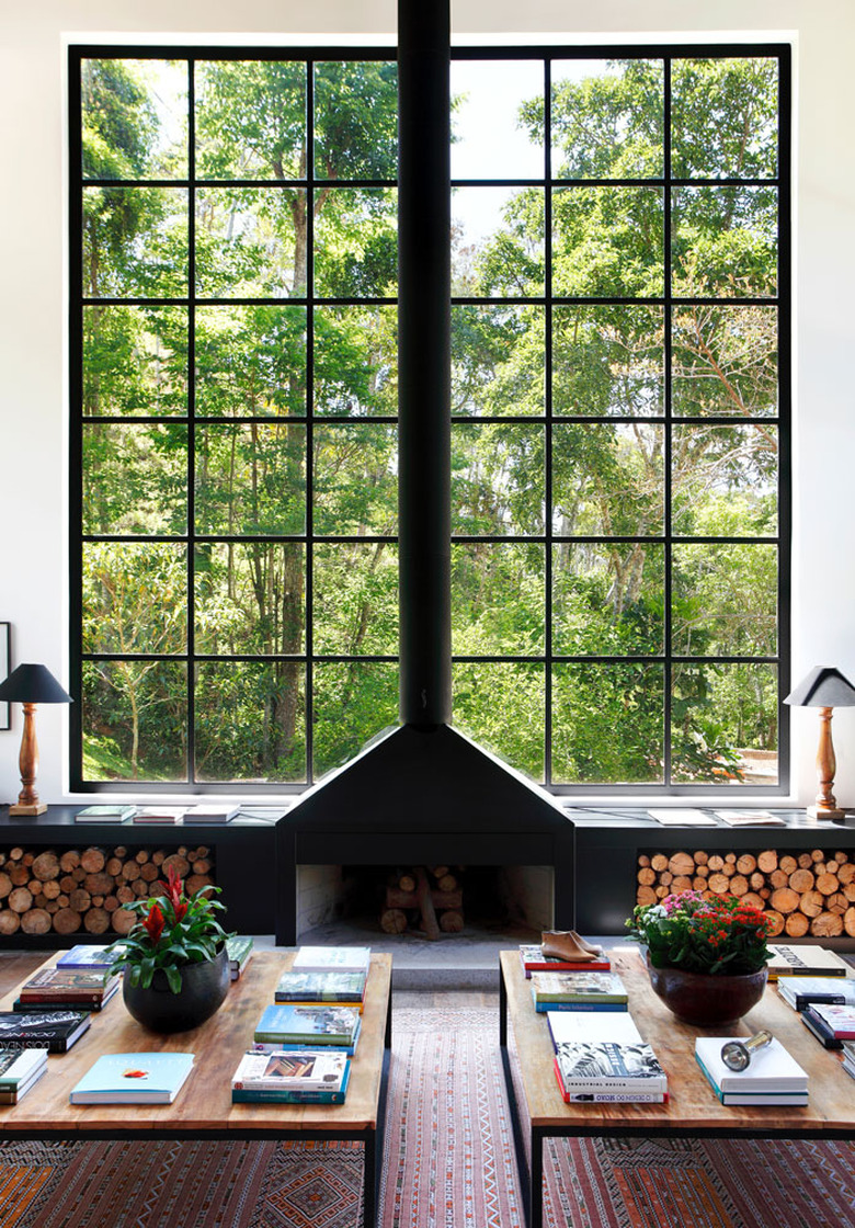 The architecture firm that designed this dream house has us packing our bags for Rio De Janeiro, where they are based. Check out the symmetry — one of the main tenets of good design — in this room. Wood tables and bohemian rugs add warmth to the high contrast architectural elements. We heart everything about this.