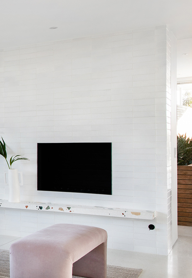 Sarah Sherman Samuel does it again, this time in an overhaul of Mandy Moore's Los Angeles home. A terrazzo bench made of hand-selected marble pieces (how's that for custom?) adds just the right amount of color and texture to an all-white tiled fireplace.