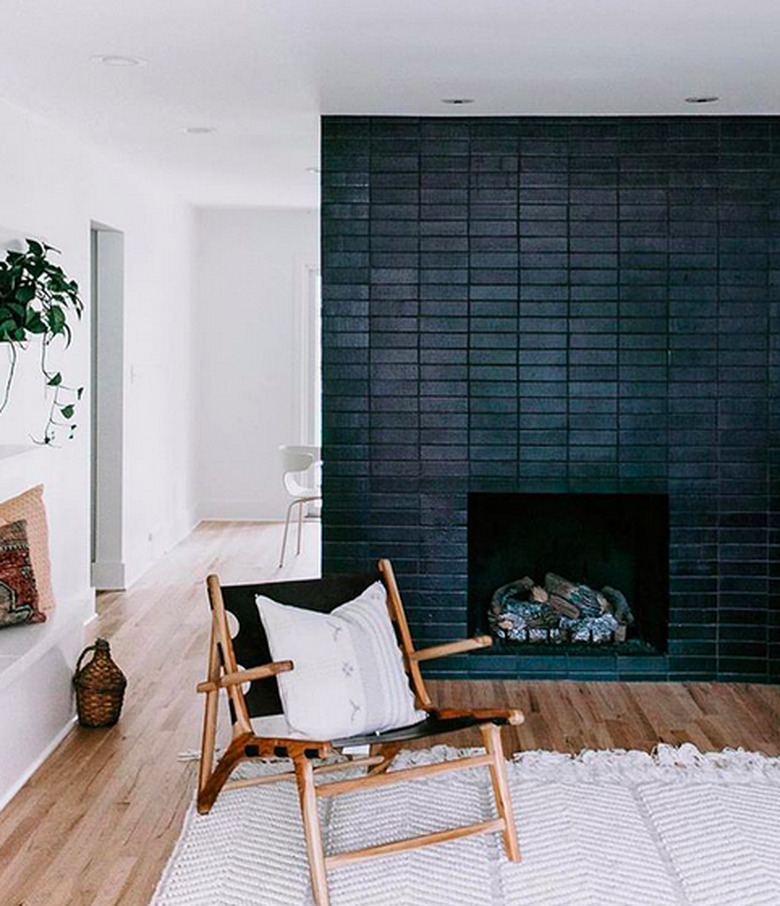 Sustainably-made black brick tiles by one of our favorite manufacturers, Fireclay, takes our love of all things brick to the next level. The dramatic fireplace grounds an otherwise all-white room and creates welcome tension with high definition contrast.