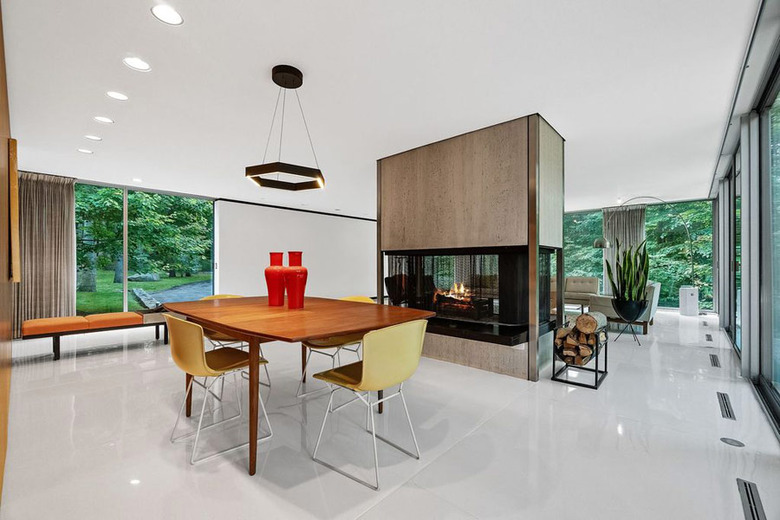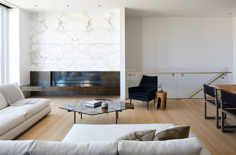We love the modern makeover that marble gets in this elegant fireplace. By bringing this natural material from the ceiling almost all the way down to the floor, Catherine Kwong creates a show-stopping centerpiece that functions as a piece of art in a minimalist room. The simple glass front and bronze accent mimic the horizontal orientation so there aren't any competing lines.
