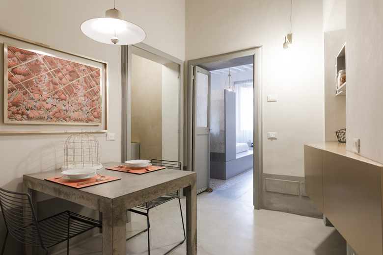 An open plan dining area and kitchen is situated outside the bedroom in the left corner apartment. Gold accents create a sparkling contrast with the Martin Bachmann cement table.