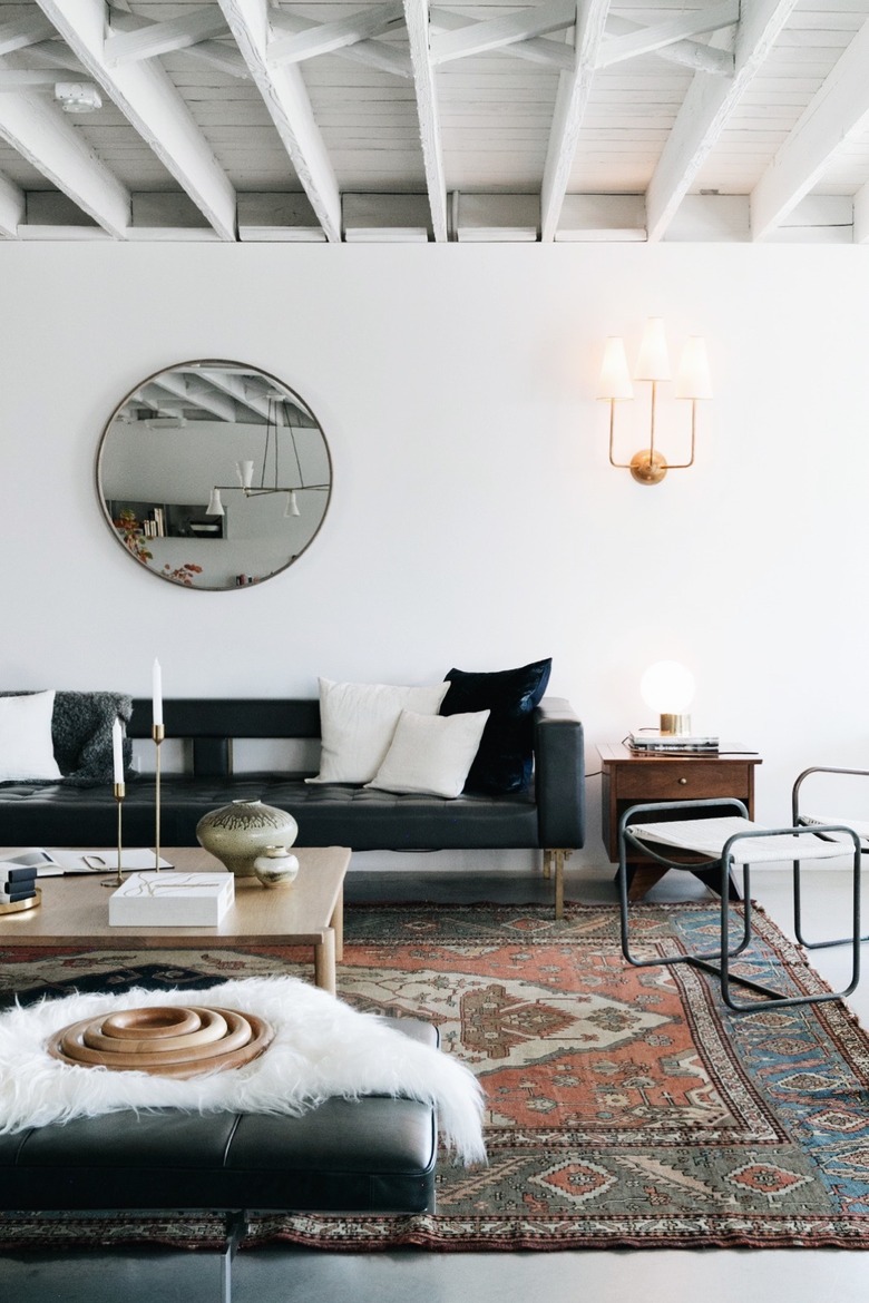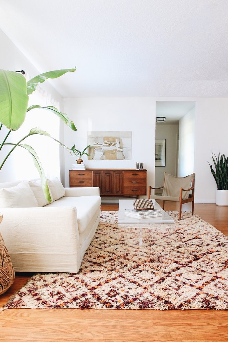 You can always choose a more minimalist aesthetic if that's a better fit for your lifestyle. Between the simple yet chic furnishings, cool coffee table, and geometric area rug, this space styled by Emily of The Sweet Beast is a study in midcentury minimalist design.