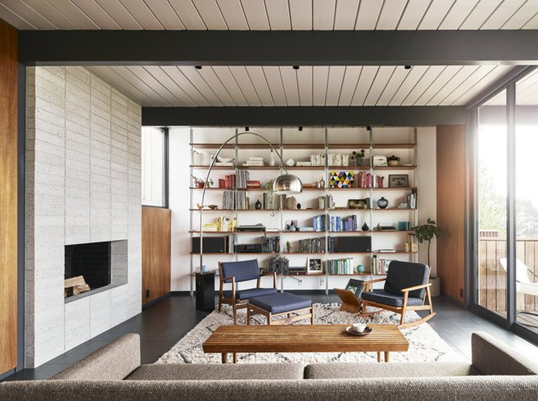 Transform your living room into a midcentury reading nook like the one in this Eichler home designed by Michael Hennessey Architecture. Pair cozy seating with timeless pieces such as an Arco floor lamp and Vitsoe bookcase. A midcentury fireplace feels just right here alongside the floor-to-ceiling shelving unit, too.
