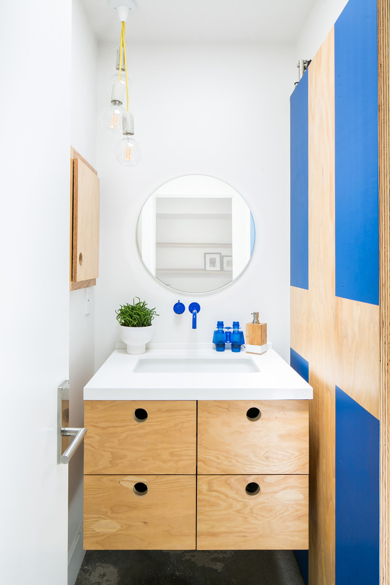 The vertical shiplap walls in this bathroom oasis, belonging to tiny house dweller Bela Fishbeyn, are swathed in a decadent hue that conjures images of the deep blue sea. Exposed wood beams on top of a white ceiling contributes to the breezy ambiance.
