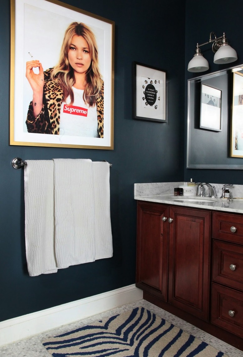 In this stylish bathroom belonging to blogger Robin Anderson, navy blue acts as the perfect backdrop for an oversize-framed print of supermodel Kate Moss.