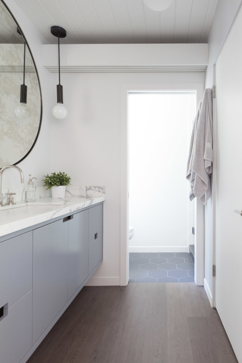 Take notes from this Homepolish design and upgrade your master suite by painting the walls white and installing a floating vanity cabinet finished in a soothing icy blue-gray. The result: a beautifully airy space that promises to help you relax in no time.