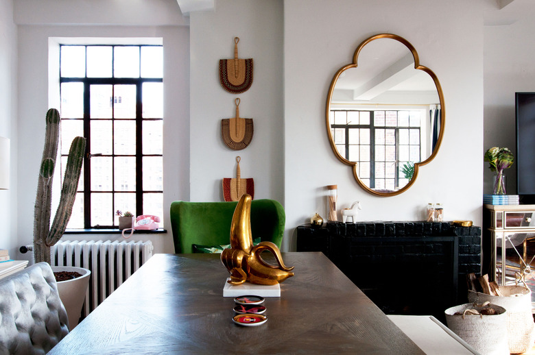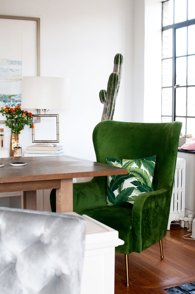 Sturino works from home, and when she moved into the apartment, one of her first purchases was the long, wooden dining room table from Wayfair that functions as a desk. The honey-colored construction is complemented by eclectic seating — a pair of brilliant emerald green wingback chairs by Mistana at the head and foot, flanked by velvet cushioned storage benches by iNSPIRE Q. Aside from a Jonathan Adler banana sculpture centerpiece, the table is uncluttered on the day of Hunker's shoot, a rarity, according to Sturino, who jokes about the number of half-full iced coffee cups that would normally be sitting out.