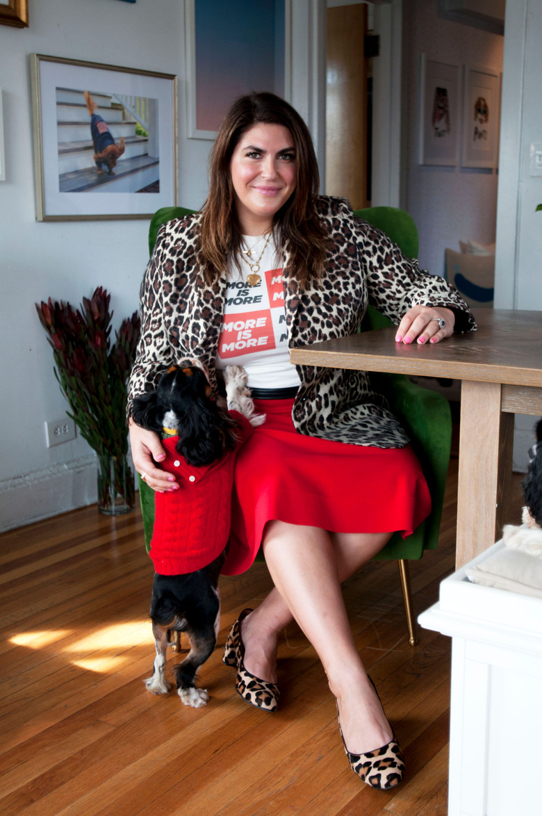 After a beat, she shifts in the seat of her emerald velvet wingback chair, apologizing for the momentary distraction. "I'm just waiting for Sock to pee on the rug. She was thinking about it."
