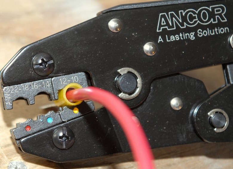 Crimping is a style of joining wires to metal fittings that are then used to connect the wire to another wiring component or to other wires. The fittings themselves come in various styles, and are collectively known as "crimp connectors." They are most commonly used with stranded wires found in the wiring of appliances, electronics, or automobile systems. The technique involves compressing a small insulated metal sleeve on the end of the connector around the exposed bare wires. Wire connections using crimp connectors are often used in locations where the heat of soldering is not appropriate, or where the wire connection may need to be detached occasionally. Connections made with crimp connectors take up little space; they also are easier to make than solder connections and when done properly, they can be just as effective. When you crimp a connector onto the end of a wire, the idea is to form a tight, continuous electrical union between the wire and the connector fitting that will stay together permanently. To achieve this, both the connector sleeve and the wire both have to be malleable enough to deform under a compressive force.