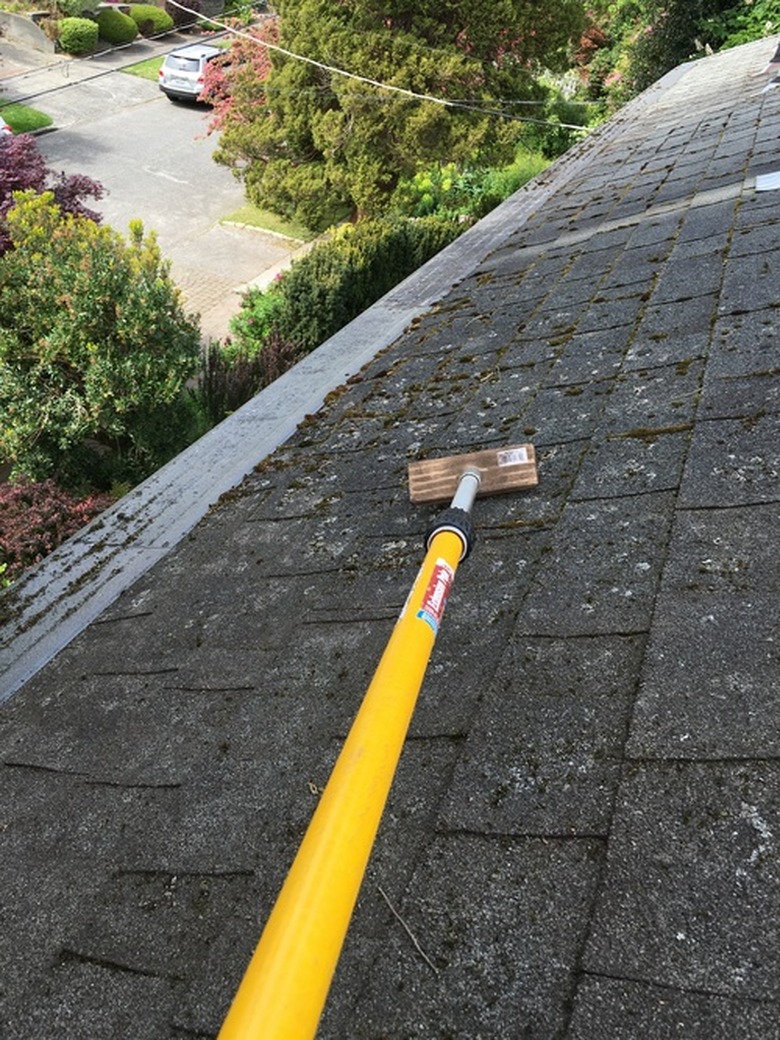 After allowing the moss-killing solution to do its work, you must physically remove the moss. Use a scrub brush or push broom to do this, always moving the scrubber in a downward motion. If you scrub upward, you can break shingle, which can allow moisture to seep underneath them.