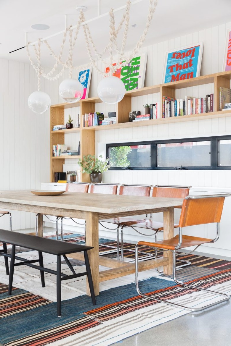 Accent your home's original features, such as shiplap walls or hardwood flooring, with ultra-modern decor. In this dining room crafted by Amber Lewis, white shiplap walls blend seamlessly with vibrant au courant furniture and accessories, resulting in a space that's full of charm and texture.