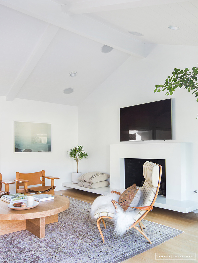 In this airy, white living room freshened up by interior designer Amber Lewis, a heavy, awkward fireplace surround was removed to allow for the slick, clean version that took its place. The new fireplace also includes a mantel with enough space for the homeowner's TV. Let the Netflix binge-a-thon begin.