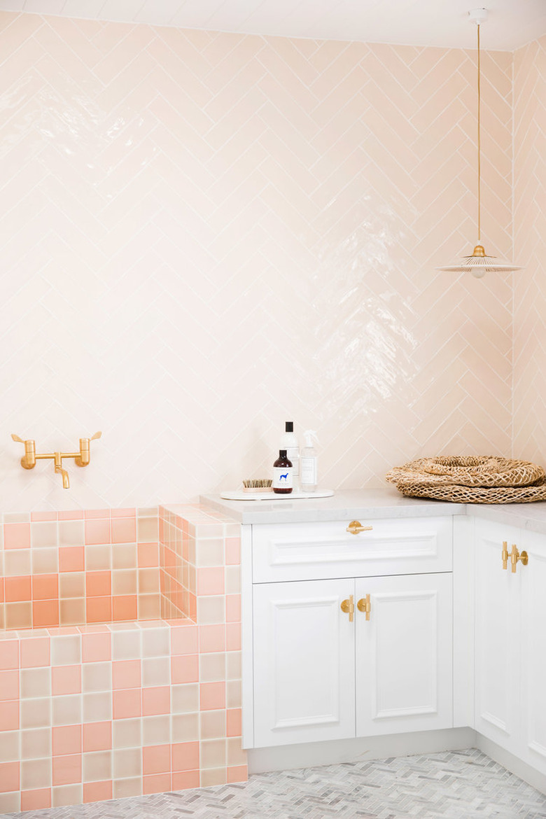 Bonnie, Lana, and Erin of Three Birds Renovations designed this pleasantly-pink bathroom, outfitted with a vintage-like tile around the bathtub, along with a more modern herringbone-patterned tile on the walls. Clearly, mixing old and new can be a match made in design heaven.