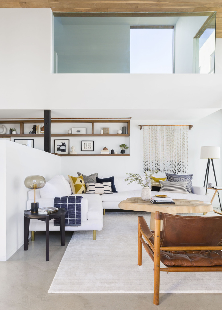 Emily Henderson says that this home was once filled with dark features like black granite and brushed aluminum. Today, it's fresh and light-filled thanks to painted white walls, light wood accents, and a dash of bohemian flair.