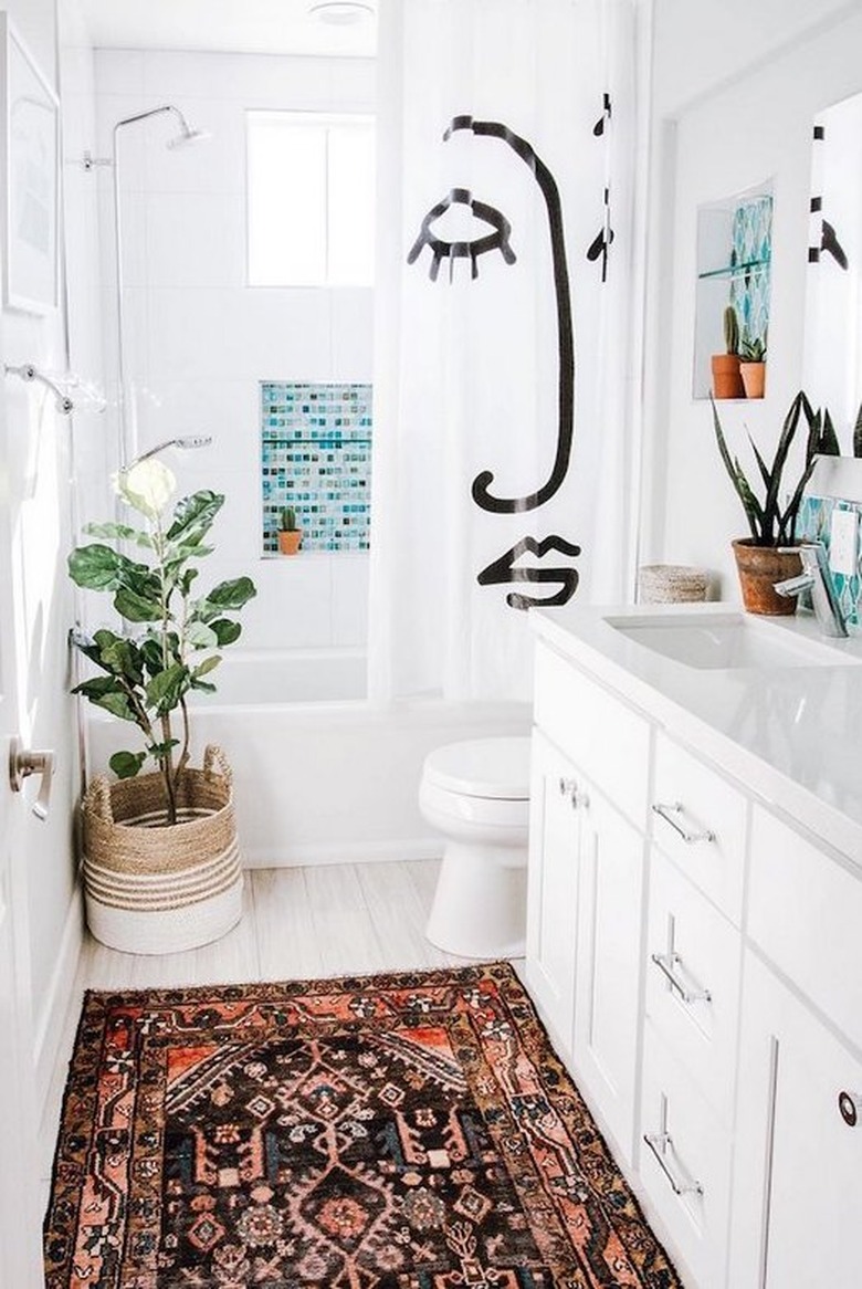 An all-white space is literally a blank canvas. Inject personality like Anita Yokota did in this bathroom with whimsical accents such as a shower curtain showcasing a hand-drawn face, an area rug, and verdant plants.