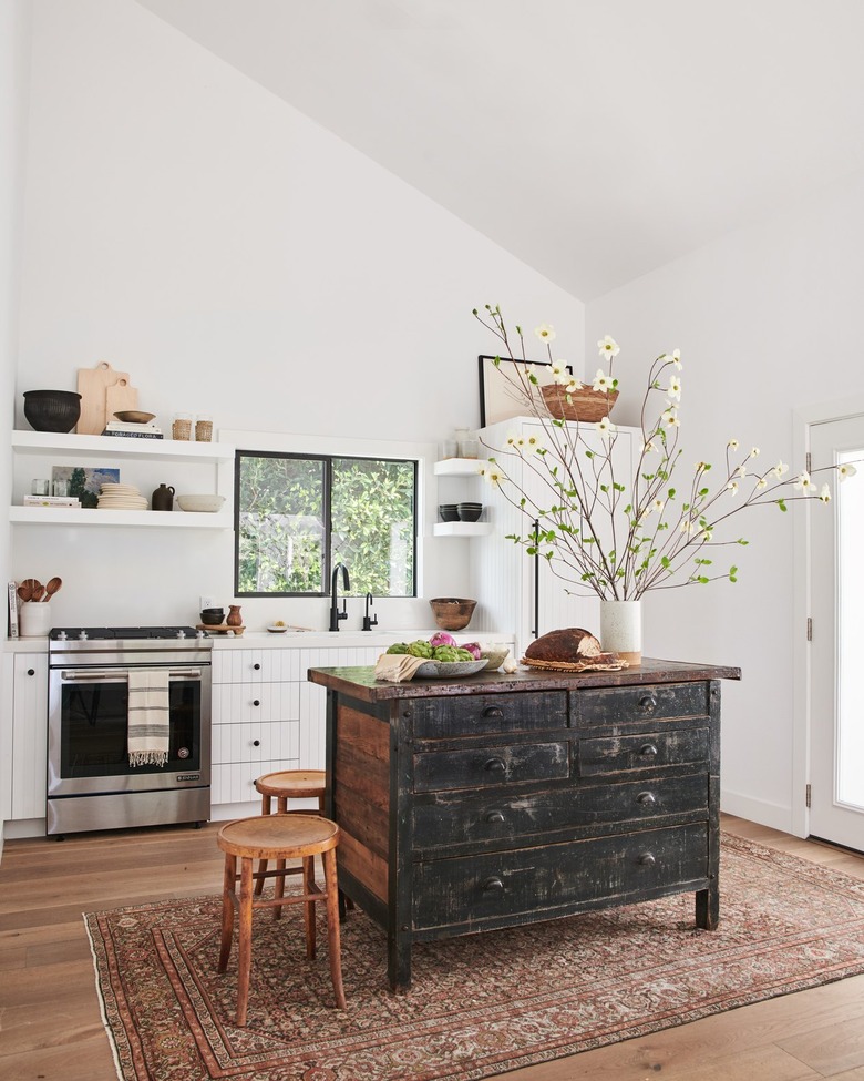 Designer Emily Henderson schools us on the art of turning a kitchen island into a veritable focal point. A matte black distressed finish gives the structure a leg to stand on while the lighter surrounding cabinetry frames the room with a grounding effect.