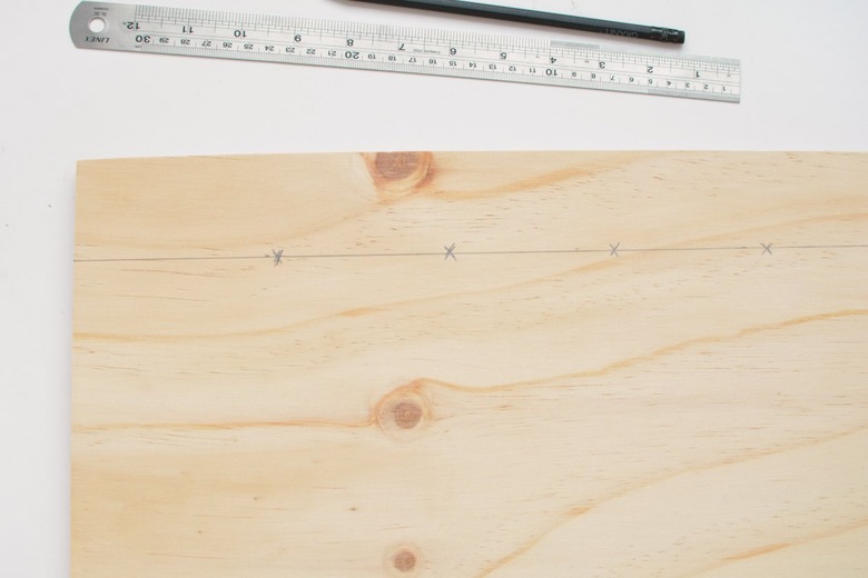 Now, for the lower row of pegs, draw a horizontal line two inches from the bottom of the plywood and mark drill points at 3-1/4 inch intervals.