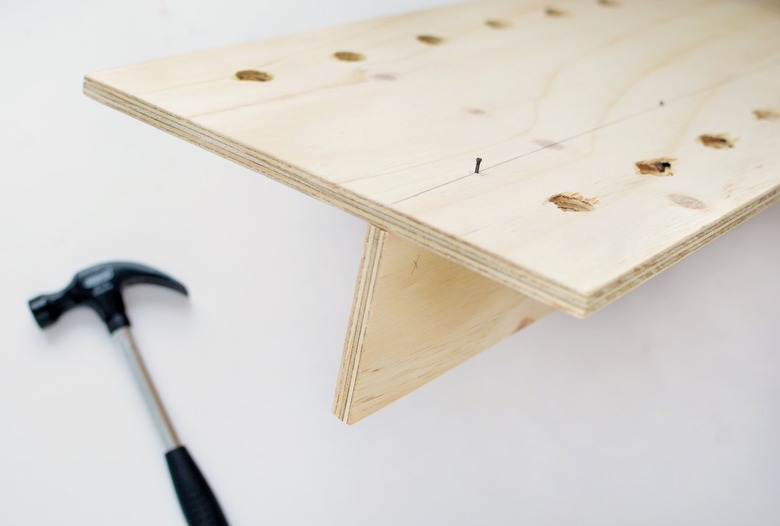 Mark a line where you want the shelf to sit on the larger board — ours is four inches up from the bottom. Flip the plywood over and mark a line at the same height on the other side. Hold the shelf in place, and then tap in some 1-inch nails through the back to attach the shelf. (You can also glue the shelf in place before you nail into it.)