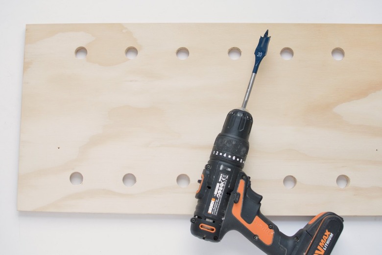 Take the wood dowel and cut it into 2-inch pieces using a small hacksaw. You only need to put pegs in some of the holes otherwise you'll lose that pegboard effect. Somewhere between five to 10 wooden pegs should suffice.