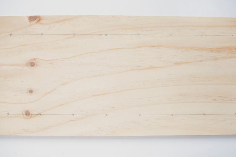 On the larger piece of plywood, mark where the pegs will be located. For the upper row of pegs, draw a horizontal line two inches from the top. Mark drill points at 3-1/4 inch intervals along this line.