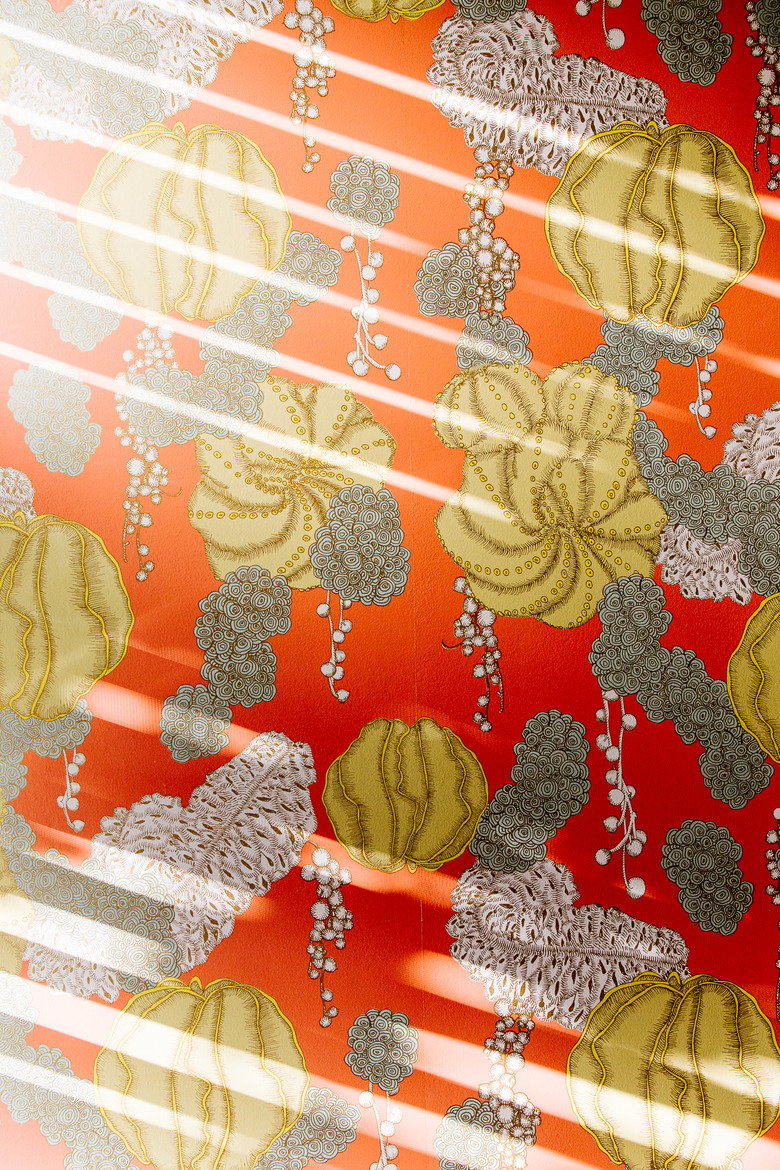 Of course, the couple wouldn't dare place even one nail through that wall, as it's a work of art in itself, but there are other ways they have personalized the space. In the downstairs playroom, a colorful collection of kid and adult guitars are displayed (coincidentally) in a zigzag pattern across one wall. In the second-floor bathroom, they added exquisite floral wallpaper by the Portland-based design collective called Makelike, which they purchased through Walnut Wallpaper. On other walls hang works by local artists: a Seonna Hong painting in the entryway, Catherine Ledner's whimsical animal portraits in their den, and a Felipe Dupouy photograph of an L.A. bridge over their fireplace — "the only artwork that we purchased for a specific spot in our home," says Yudacufski.