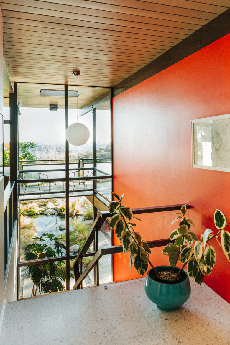 For any first-time visitor to the Schneider Residence in the San Rafael Hills of Pasadena, California, the quaint street-level view of the carport does little to prepare you for what comes after you descend the steep staircase to the home and pass through its baby-blue front door: a vision that truly takes your breath away.