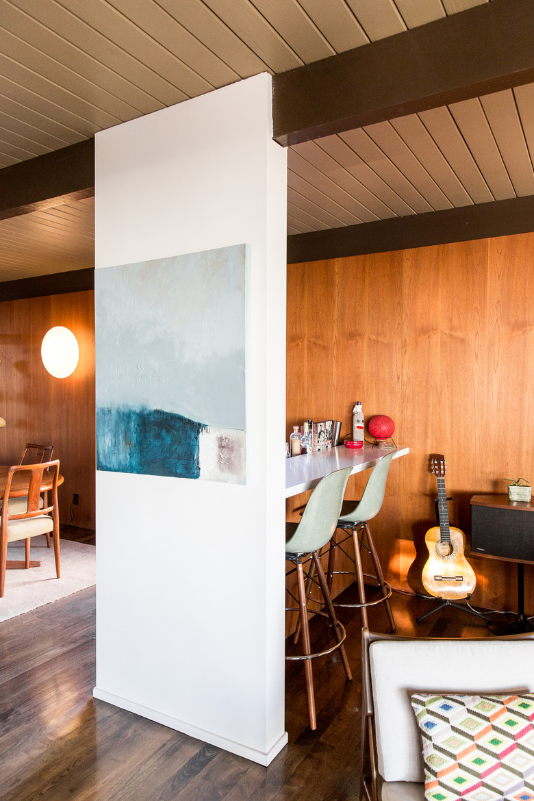 To suit their 21st-century living, Yudacufski and Sogomian did some renovations — they changed the original Formica countertops to Caesarstone and replaced the 1960s stove that had only one working burner with a Miele induction cooktop. The previous owners had expanded the master bath and added built-in shelving in the den plus shelving and desks in the office, but apart from those updates, the home was already in amazing condition when they first toured it — thanks to the quality of materials used and largely because those previous owners, also architectural buffs, were deeply invested in preserving the integrity of the home versus stripping it of its character. Yudacufski and Sogomian applauded them for this in their lengthy heartfelt offer letter to the owners that likely helped them win the bidding war on the house in 2011: "We have seen too many midcentury homes that have been ruined by their owners' unfortunate design and renovation choices ... very exciting and refreshing to see a home like yours!"